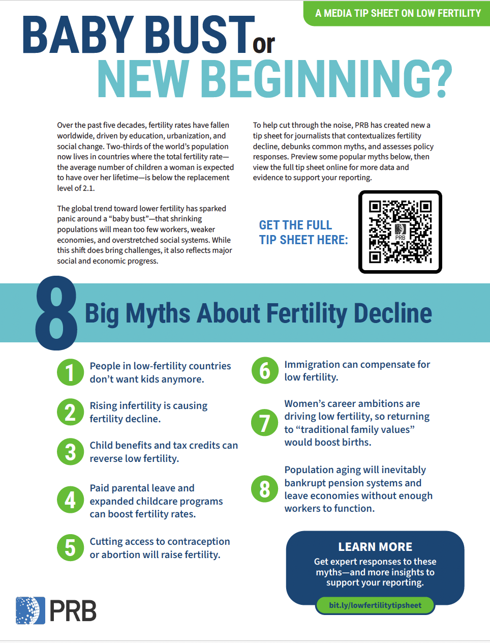 This tip sheet explains what’s behind falling fertility rates, clears up common myths, and explores how policymakers can respond. It aims to spark informed, data-driven reporting that shifts the focus from fear to facts and from panic to practical solutions that support societies to adapt and thrive.