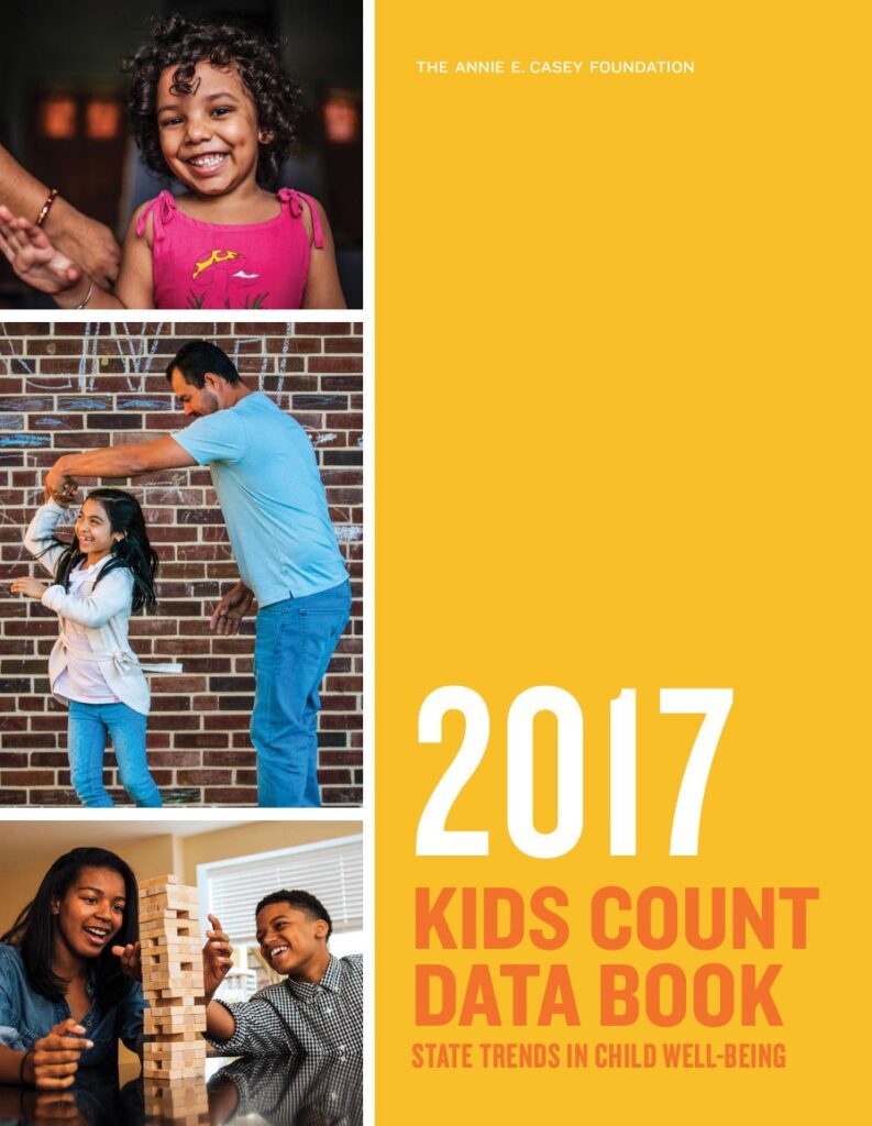 The Annie E. Casey Foundation released the 2017 KIDS COUNT Data Book on June 13, 2017. The KIDS COUNT Data Book—now in its 28th year—provides an up-to-date and detailed picture of how children are faring in the United States, nationally and in each state. The KIDS COUNT Data Book features a comprehensive index of child well-being and includes a national profile and state-level rankings across four content domains: (1) Economic Well-Being, (2) Education, (3) Health, and (4) Family and Community. The 2017 Data Book reveals many bright spots for children and family well-being during the economic recovery following the Great Recession, yet room for improvement remains in many areas.