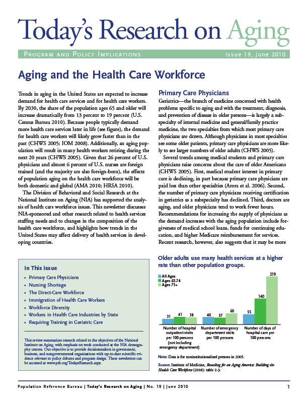 The Division of Behavioral and Social Research at the National Institute on Aging has supported the analysis of health care workforce issues. This newsletter discusses NIA-sponsored and other research related to health services staffing needs and to changes in the composition of the health care workforce, and highlights how trends in the United States may affect delivery of health services in developing countries.</p>