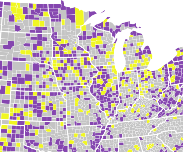 Here’s a map showing the 452 U.S. counties (shaded yellow) that would have lost population between 2023 and 2024 without immigration. In another 822 counties (shaded purple), immigration helped offset population losses, so depopulation was not as severe as it would have been.