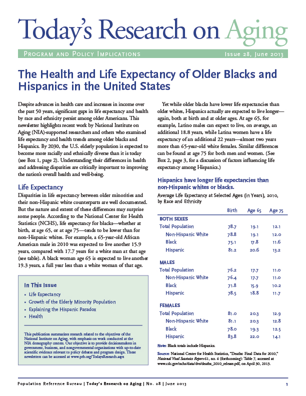 Despite advances in health care and increases in income over the past 50 years, significant gaps in life expectancy and health by race and ethnicity persist among older Americans. This newsletter examines life expectancy and health trends among older blacks and Hispanics. By 2030, the U.S. elderly population is expected to become more racially and ethnically diverse than it is today. Understanding their health differences and addressing disparities are critically important to improving the nationโs overall health and well-being.