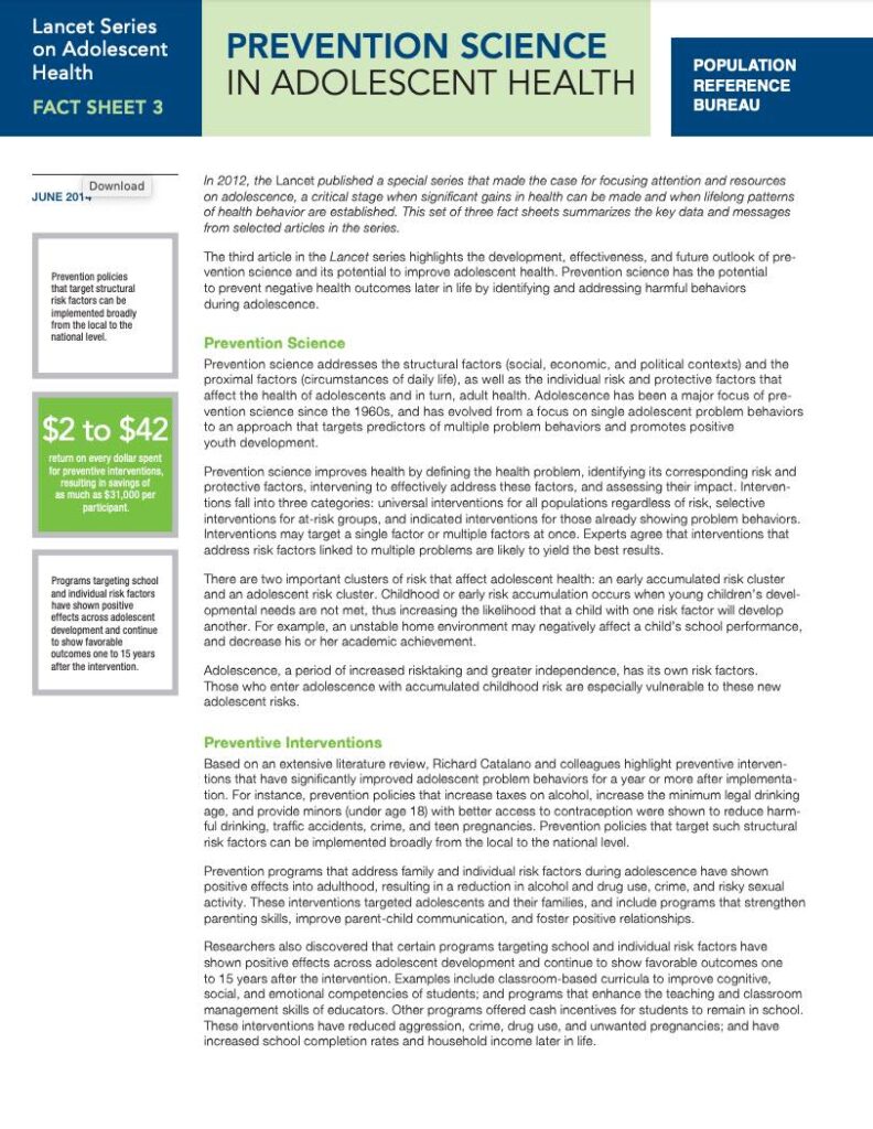 Fact Sheet 3, Prevention Science in Adolescent Health, explains prevention science and how it applies to adolescent health. Adolescence has been a major focus of prevention science research and practice for over four decades. This fact sheet, based on a comprehensive analysis by Richard Catalano and colleagues, highlights some of the most promising preventive interventions to improve and protect adolescent health. Barriers to the application and expansion of prevention science in adolescent health are also described.