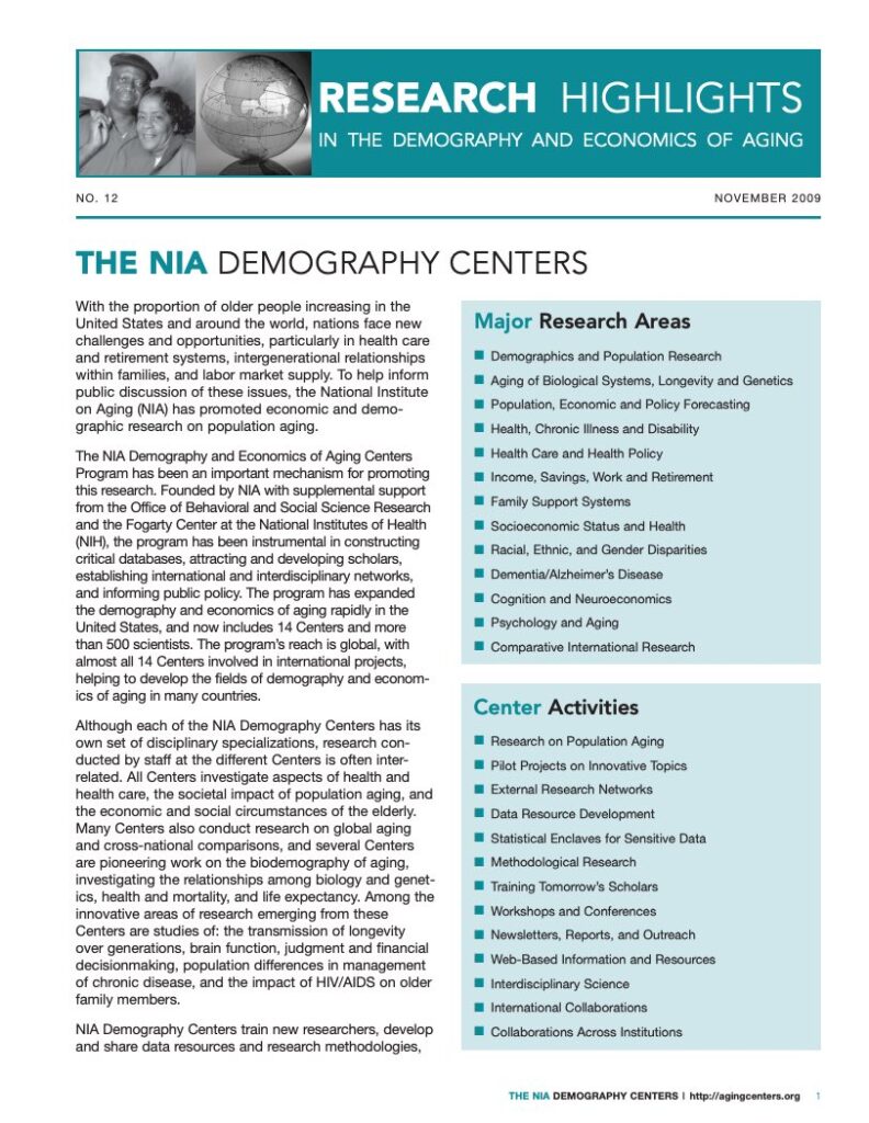 The NIA Demography and Economics of Aging Centers Program has been an important mechanism for promoting this research. Founded by NIA with supplemental support from the Office of Behavioral and Social Science Research and the Fogarty Center at the National Institutes of Health (NIH), the program has been instrumental in constructing critical databases, attracting and developing scholars, establishing international and interdisciplinary networks, and informing public policy. The program has expanded the demography and economics of aging rapidly in the United States, and now includes 14 Centers and more than 500 scientists. The program’s reach is global, with almost all 14 Centers involved in international projects, helping to develop the fields of demography and economics of aging in many countries.