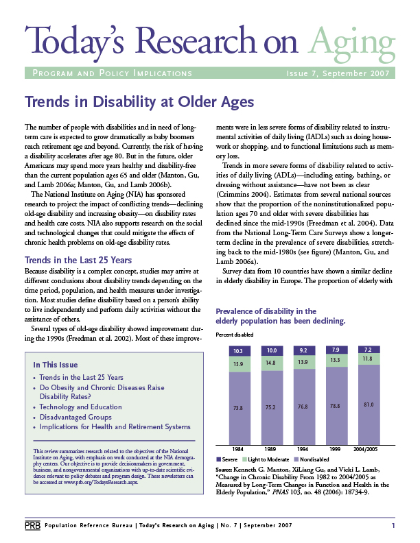 This issue, “Trends in Disability at Older Ages” highlights National Institute on Aging-funded research and other recent research that explores the impact of conflicting trends (declining old-age disability and increasing obesity) on disability rates and health care costs.