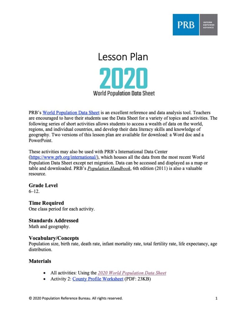 Lesson Plan. 2020 World Population Data Sheet (PDF)