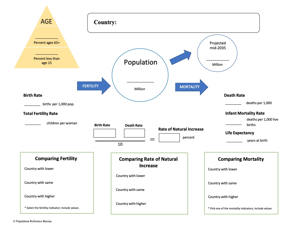 Resource: PRB’s International Data Center  is particularly useful for this activity. It includes all the data from the most recent World Population Data Sheet except net migration. Data can be displayed as a map or table and downloaded.