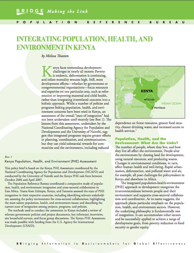 This policy brief, Integrating Population, Health, and Environment in Kenya, is based on the Kenya PHE assessment coordinated by the National Coordinating Agency for Population and Development (NCAPD) and conducted by the University of Nairobi and the Kenya PHE task force between October 2006 and April 2007. The methods used to conduct the assessment in Kenya included a review of relevant government policies and project documents, key informant interviews, site household surveys, and focus group discussions.
