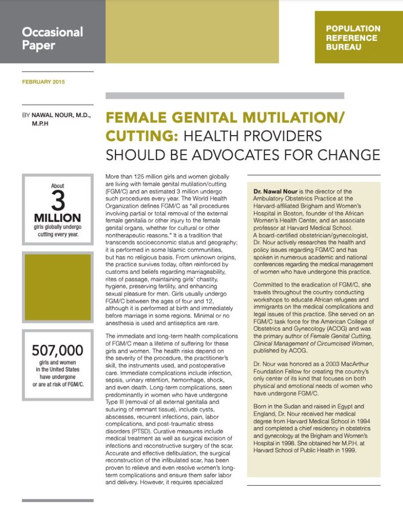 (February 2015) When the African Women’s Health Center (AWHC) first commissioned a study based on the 2000 U.S. Census, they found that approximately 228,000 women and girls living in the United States have either undergone or are at risk of FGM/C. The “at-risk” number reflected a staggering increase of approximately 35 percent from the 1990 census estimate. New numbers being released by the Population Reference Bureau on Feb. 6th, 2015, reveal that 507,000 girls and women in the United States today have either undergone or are at risk of FGM/C. These growing numbers demonstrate that U.S. health providers will be examining more patients with FGM/C. Though some hospitals and health centers in the United States have created a culturally and linguistically competent environment for women with FGM/C, these still do not meet the needs of this population. More often, women with FGM/C have received poor-quality care, which understandably creates an environment of distrust towards our health care system. Women with FGM/C are not only likely to experience inappropriate encounters with health providers, but they are also subject to disparities in care, with lower rates of mammograms, pap smears, vaccinations, and family planning services. If medical interpreters are used, evidence-based preventive medicine is more consistently applied.