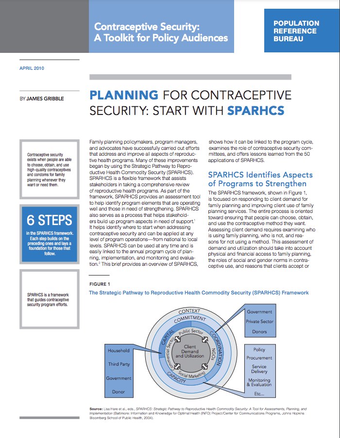 (May 2010) Family planning policymakers, program managers, and advocates have successfully carried out efforts that address and improve all aspects of reproductive health programs in developing countries. Many of these improvements began by using the Strategic Pathway to Reproductive Health Commodity Security (SPARHCS). SPARHCS is a flexible framework that assists stakeholders in taking a comprehensive review of reproductive health programs.