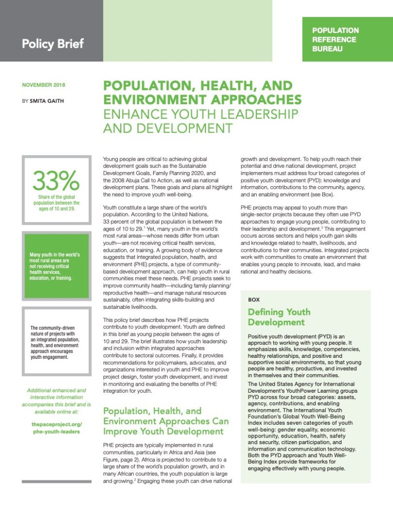 Policy Brief. Population, Health, & Environment Approaches: Enhance Youth Leadership & Development (PDF)