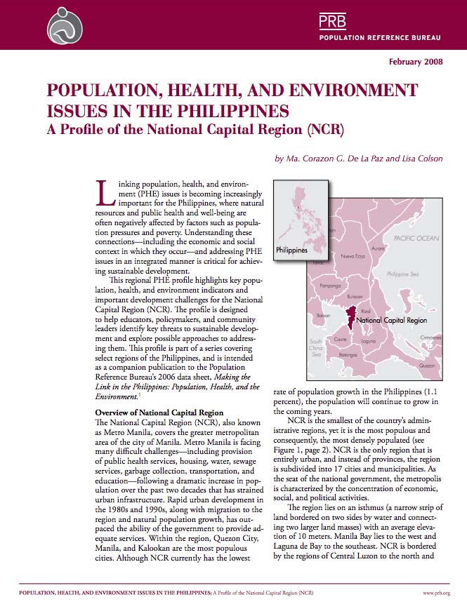 This regional PHE profile highlights key population, health, and environment indicators and important development challenges for the National Capital Region (NCR). The profile is designed to help educators, policymakers, and community leaders identify key threats to sustainable development and explore possible approaches to addressing them. This profile is part of a series covering select regions of the Philippines, and is intended as a companion publication to the Population Reference Bureauโs 2006 data sheet, Making the Link in the Philippines: Population, Health, and the Environment.