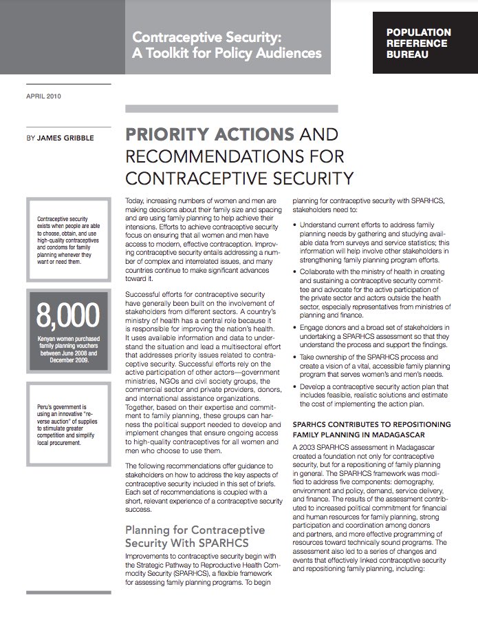 Priority Actions and Recommendations for Contraceptive Security is one of seven PRB policy briefs that make up Contraceptive Security: A Toolkit for Policy Audiences, a series designed to explain different aspects of contraceptive security to policymakers, program managers, media, and civil society. This final brief provides recommendations to guide stakeholders on how to address the key aspects of contraceptive security included in the previous briefs. Each set of recommendations is coupled with a short, relevant experience of a contraceptive security success.