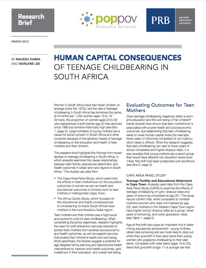 This PopPov network research brief highlights the findings from recent studies on teenage childbearing in South Africa, in which analysts examined the causal relationships between teen fertility, educational attainment, and health outcomes in urban and rural regions in South Africa. The studies use data from:
