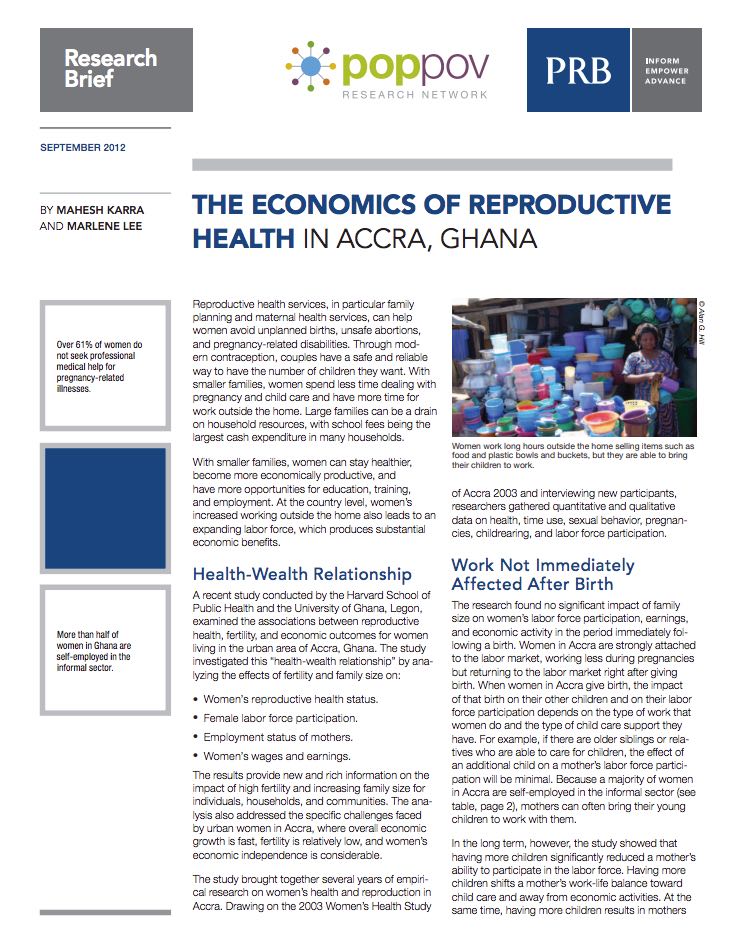 This PopPov network research brief highlights findings from a recent study conducted by the Harvard School of Public Health and the University of Ghana, Legon. The study examined the associations between reproductive health, fertility, and economic outcomes for women living in the urban area of Accra, Ghana, and investigated this โhealth-wealth relationshipโ by analyzing the effects of fertility and family size on: