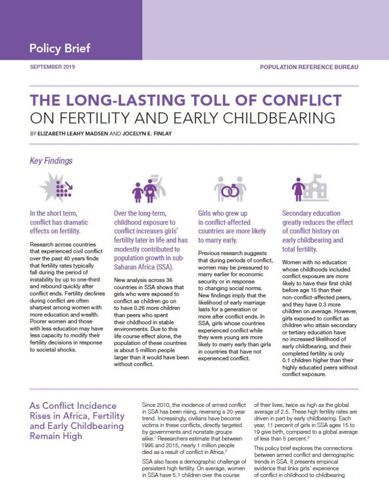 A new PRB policy brief builds upon this previous research, breaking new ground by examining long-term trends in fertility in SSA among girls who lived in conflict zones when they were very young. The findings show that early childhood exposure to conflict has long-lasting repercussions—and those repercussions vary based on women’s eventual education.