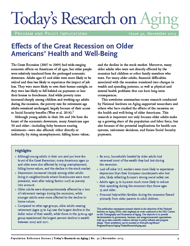 Today’s Research on Aging, Issue 32: Effects of the Great Recession on Older Americans’ Health and Well-Being