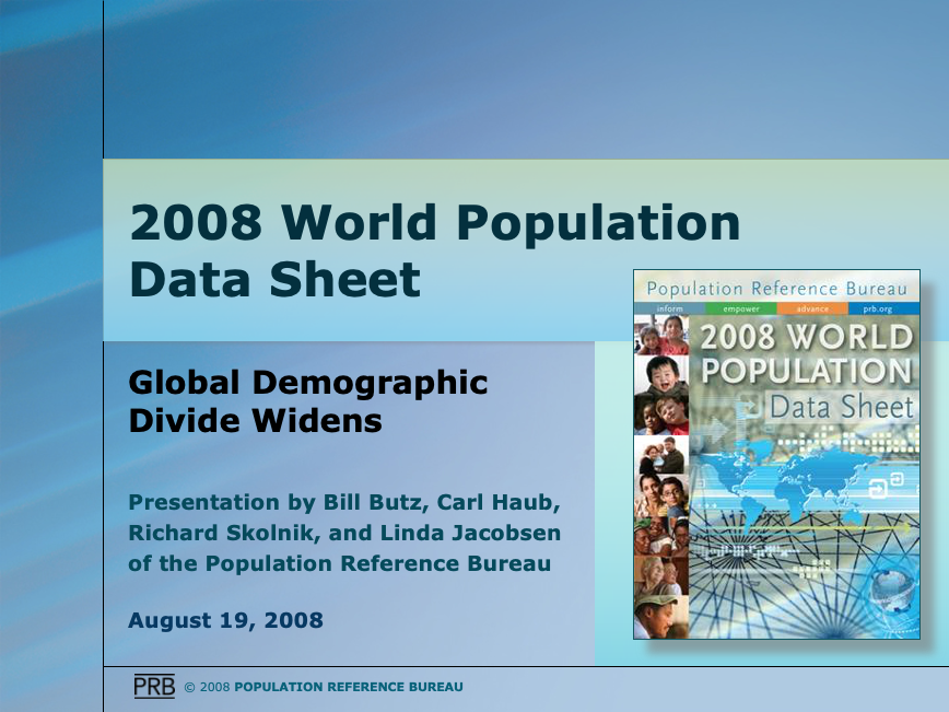 (August 2008) The Population Reference Bureau released its 2008 World Population Data Sheet on Aug. 19, 2008, at the National Press Club in Washington, DC.