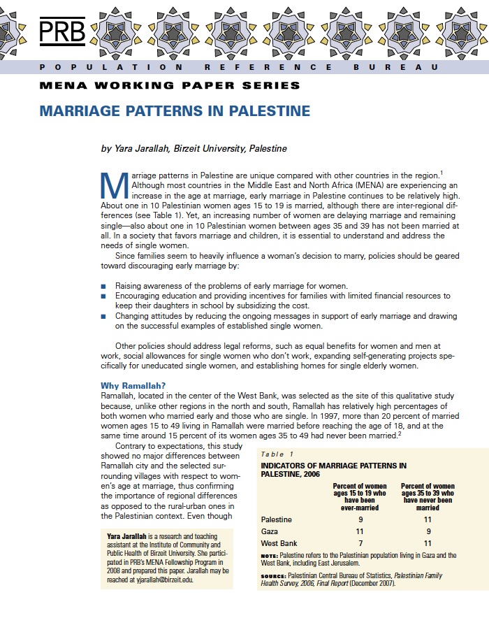 (October 2008) Marriage patterns in Palestine are unique compared with other countries in the region. Although most countries in the Middle East and North Africa are experiencing an increase in the age at marriage, early marriage in Palestine continues to be relatively high. About one in 10 Palestinian women ages 15 to 19 is married. Yet, an increasing number of women are delaying marriage and remaining single. In a society that favors marriage and children, it is essential to understand and address the needs of single women.